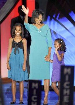 Al terminar, se rodeó en el escenario de sus hijas Malia y Sasha, de 10 y 7 años, a ellas se unió vía vídeoconferencia el propio Barack Obama, que se encuentra de campaña en Misuri.