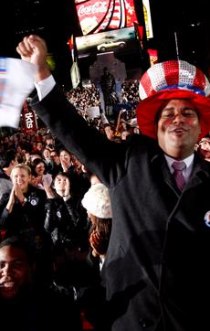 Los neoyorquinos celebraron en Times Square con gritos, vítores y sonando el claxon de sus automóviles. "Yes, we can, yes, we can (Sí, podemos)", el eslogan adoptado por Obama durante su campaña, era gritado al unísono por muchos neoyorquinos que, en medio de un ambiente festivo, algunos con pancartas y otros con banderas estadounidenses o con el símbolo de la paz, festejaban el triunfo del demócrata ante McCain.