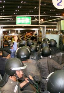 La ocupación del aeropuerto internacional de Bangkok, por donde transitan diariamente unos 125.000 pasajeros y cuyas pistas utilizan un promedio de 76 aviones cada hora, comenzó en la noche de este martes con la terminal de salida y se prolongó durante toda la madrugada por fases. La dirección de Suvarnabhumi, incapaz de contener la avalancha de seguidores de la Alianza, suspendió todos los vuelos, dejando a miles de turistas atrapados entre los disturbios entre grupos progubernamentales y opositores.