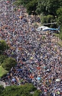 Decenas de contingentes partieron desde diferentes puntos de Caracas para confluir en la avenida Bolívar, una de las principales arterias de la capital venezolana. Una vez allí bailaron a ritmo de reggaetón un tema en alusión al incidente con el Rey Juan Carlos durante la XVII Cumbre Iberoamericana de jefes de Estado y de Gobierno celebrada en Chile. Según los organizadores, esta ha sido una de las mayores concentraciones de los últimos años. Los informes hablan de una cifra superior a las quinientas mil personas.Ya en el estrado, el alcalde de Chacao –una de las cinco municipalidades de Caracas– y dirigente opositor Leopoldo López dijo que "llenamos la Bolívar y mas allá (otras calles aledañas), sin autobuses, y eso significa que existe la conciencia de salir a votar no". Aludía a las movilizaciones oficialistas en las que se suelen ver cientos de autobuses alquilados y vehículos oficiales procedentes de todos los rincones del país. López provocó la algarabía de los manifestantes cuando señaló que "por primera vez todas las encuestas indican que hay una mayoría contundente contra el referendo".