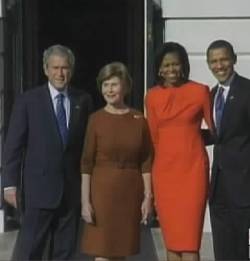 Los próximos inquilinos de la Casa Blanca llegaron a la residencia oficial once minutos antes de la hora prevista, las 19.00 GMT, y posaron para las cámaras durante unos breves instantes tras los apretones de manos y saludos de rigor. El presidente electo se saltó ligeramente el protocolo al dar una palmada en la espalda a Bush en un gesto característico suyo. Michelle lució un llamativo vestido rojo, mientras que Laura Bush eligió un más discreto modelo color café.