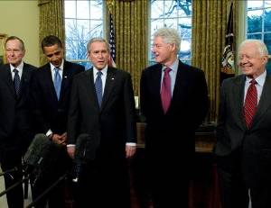 Bush, el presidente actual, se colocó en el centro, junto a Obama y Clinton. En los extremos quedaron George W. Bush y Jimmy Carter. Todos ellos aparecieron sonrientes y relajados. En unas breves declaraciones, el presidente saliente aseguró a Obama, que asumirá el poder el próximo día 20, que "todos nosotros queremos que tenga éxito".