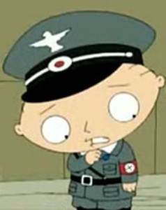 Allí, junto a otros dos personajes Stewie –el bebé que habla– le propinan una paliza a tres oficiales nazis para quitarles sus uniformes. "Hey, hay algo aquí", avisa Stewie, que se sujeta la solapa para distinguirse un pin con fondo azul y letras en blanco con el tamdem McCain-Palin. Irónico, Stewie dice: "Uy, que raro".