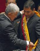 En la sede del Parlamento, Correa firmó su primer decreto en el que asume el cargo "por mandato de la Constitución y en cumplimiento de la voluntad del pueblo ecuatoriano". Correa, que vestía un traje pero sin corbata y una camisa con motivos indígenas, lució la banda presidencial con los colores amarillo, azul y rojo de la bandera de Ecuador.