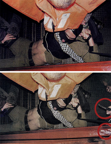 En un principio los "pacifistas" del Mavi Mármara negaron taxativamente que portaran armas, y mucho menos, que las utilizaran para amenazar o herir a los soldados israelíes que desembarcaron en el buque. Pocas horas pasaron hasta que la embajada israelí desveló el arsenal de cuchillos de toda clase con la que amenazaron e hirieron a los soldados.