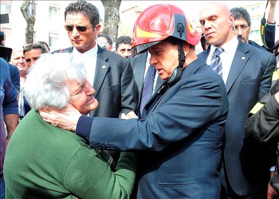 Cerca de la Casa de los Estudiantes, donde ayer fueron rescatados los cadáveres de cuatro jóvenes y hoy de otros dos, Berlusconi fue interpelado por una anciana que le dijo: "Silvio, ayúdanos porque no tenemos nada y yo no tengo ya ni los dientes" a lo que el primer ministro respondió: "Italia responde, hacemos lo posible".