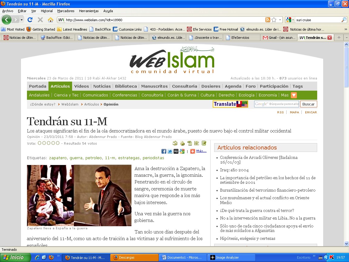 Acompañado de un montaje fotográfico de Zapatero y una víctima del 11-M, el artículo dice que "ama la destrucción a Zapatero, la masacre, la guerra, la ignominia. Penetrando en el círculo de sangre, ceremonia de muerte masiva que responde a los más bajos intereses. Una vez más la guerra nos gobierna".