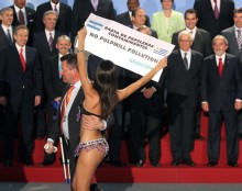 Cardoso se separó del grupo de periodistas, se despojó de su ropa ante los líderes que se preparaban para la foto de familia y quedó sólo con un atrevido bikini negro con lentejuelas de colores. En medio de la sorpresa general, la joven alzó un cartel en el que se leía "Basta de papeleras contaminantes. Greenpeace".