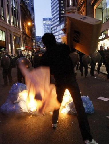Un grupo de activistas irrumpió en el edificio del Royal Bank of Scotland –símbolo de la crisis crediticia en el Reino Unido y que ha sido parcialmente nacionalizado– y rompió algunos cristales, con el resultado de dos detenciones por hurto, según indicaron los agentes. Scotland Yard había advertido a los empleados de la "City" que vistieran informalmente y, si podían, trabajaran desde casa para evitar verse inmersos en la protesta.