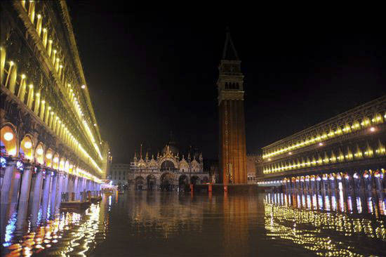 Venecia pasó la Nochebuena con marea alta, un fenómeno que se repite desde hace días y alcanzó en esta ocasión los 145 centímetros, lo que causó la inundación del 58 por ciento de la ciudad. El pasado día 23 la popularmente llamada "agua alta" alcanzó 1,32 metros.