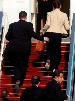 En principio ni Sarkozy, ni Ehud Olmert se dieron cuenta de lo que estaba sucediendo. Enseguida un agente de la comitiva de seguridad del presidente acompañó rápidamente a Sarkozy y a Bruni hasta las escaleras del avión, que la esposa del jefe de Estado francés subió corriendo y por delante de su marido.