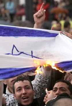 El grupo de jóvenes ha quemado también una pancarta que simulaba la bandera de Israel y en la que podía leerse la frase "Muerte a los hebreos". Asimismo, se ha prendido fuego a otra tela con los colores de la bandera de Estados Unidos, mientras decenas de manifestantes gritaban "Bush asesino".