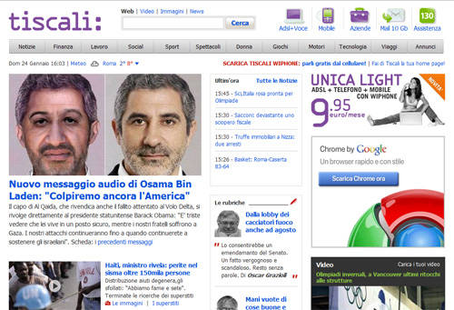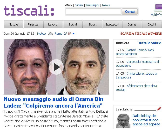 Se trata de una de las páginas web italianas más visitadas del país. El portal Tiscali ha utilizado la foto en la que se compara el retrato robot de un Ben Laden envejecido con la que empleó Gaspar Llamazares en los últimos comicios en los que se presentó como candidato.