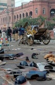De acuerdo con una fuente oficial citada por el canal de televisión Dawn, el terrorista suicida, que conducía una motocicleta, hizo estallar la carga explosiva que portaba cuando los agentes intentaron detenerlo. La misma fuente aseguró a la cadena privada que todas las víctimas son policías, mientras que otra fuente del hospital de Mayo, cercano a la corte provincial, confirmó este extremo y situó el número de heridos en 57.