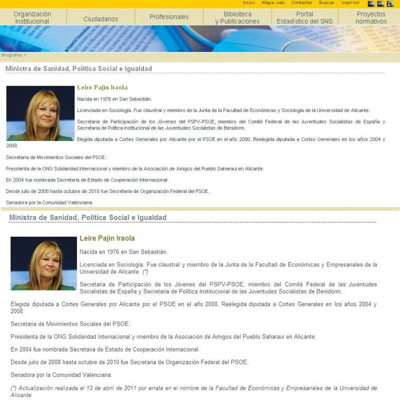 En la web del Ministerio figuraba hasta hoy mismo este dato. Tras saltar la noticia lo han corregido. Licenciada en Sociología. Fue claustral y miembro de la Junta de la Facultad de Económicas y Empresariales de la Universidad de Alicante. (*) Y abajo informan: (*) Actualización realizada el 13 de abril de 2011 por errata en el nombre de la Facultad de Económicas y Empresariales de la Universidad de Alicante