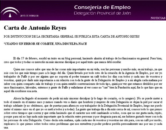 En esa carta que ya se ha hecho desaparecer conveniente de su blog, Antonio Reyes se refería despectivamente a los funcionarios y laborales de la Junta contrarios al "decretazo" de José Antonio Griñán. Ahora, se ha visto obligado a rectificar vergonzantemente no sabemos si por la Secretaría General de su partido o por la propia Junta.