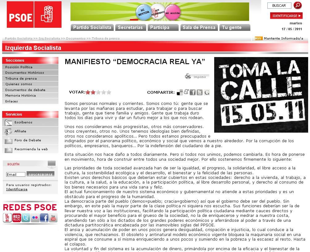 Mientras dirigentes como Blanco tratan de sacar rédito a las protestas, en el PSOE llegaron a colgar en la web el manifiesto de los "indignados". El documento fue incorporado a la página de la corriente Izquierda Socialista el pasado 7 de mayo. Las protestas de los internautas les han llevado a descolgarlo este martes y a pedir disculpas.