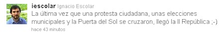 La "revuelta" tiene más incidencia en Twitter que en la propia calle, donde apenas 2.000 personas siguen en la Puerta del Sol. En las redes sociales, sin embargo, la cosa sí es algo más multitudinaria o, por lo menos, es de lo más comentado junto a la final de la UEFA entre equipos portugueses. Algo que aprovechan líderes mediáticos de la izquierda patria como Eva Hache o, a menor escala, Nacho Escolar, par hacerse más populares. La última aportación del ex director de Público es comparar lo que está pasando con la llegada de la II República: