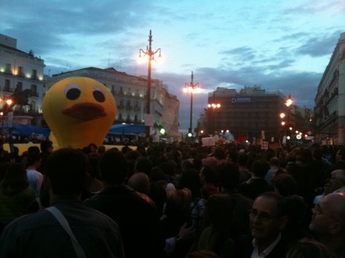 Bassi ha hinchado en la Puerta del Sol un pato gigante y ha hecho una proyección en la fachada de la Real Casa de Correos, según han explicado por Twitter algunos de los miembros de la acampada del kilómetro cero madrileño.