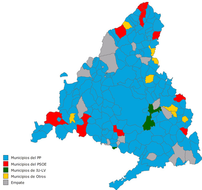 La situación es idéntica en otras zonas de la región y así queda demostrado en este mapa: la Comunidad de Madrid es azul, excepto en los once municipios donde el PSOE tiene garantizada la alcaldía por haber obtenido la mayoría absoluta.