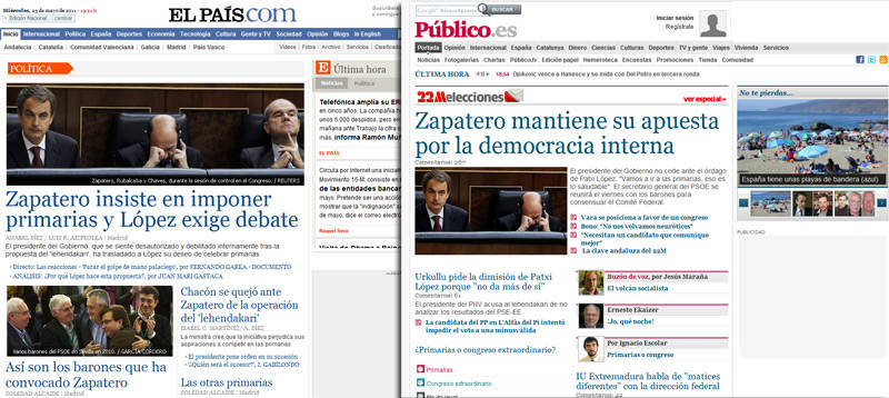 En Público, el medio que mima a Carme Chacón, presentan al presidente de forma muy distinta: Zapatero mantiene su apuesta por la democracia interna. Frente a El País, que presenta al presidente como derrotado, Público dice de él, en su versión digital, que "no cede ante el órdago de Patxi López".