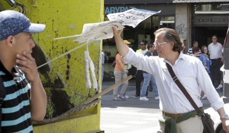 Un ciudadano se ha colado este jueves en el poblado de la Puerta del Sol y ha comenzado a retirar algunos de los múltiples carteles que ensucian la céntrica plaza madrileña, colocados por los acampados ilegalmente.