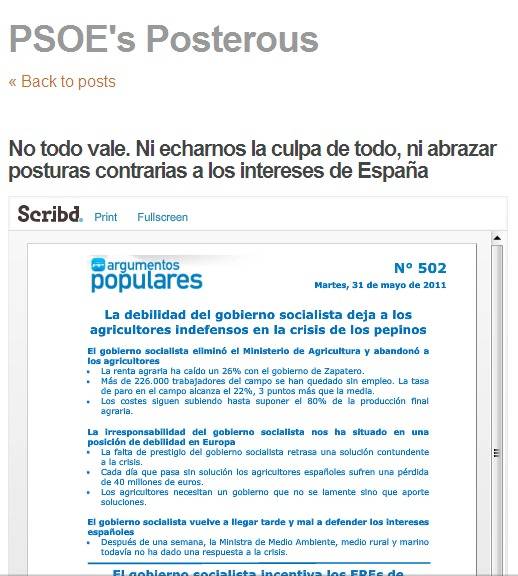 "No todo vale", dice el PSOE en Twitter refiriéndose a la actitud del PP. Y es que el partido ha tenido acceso a un argumentario interno de los populares donde estos critican al Gobierno de Zapatero por su gestión de la crisis de los pepinos.