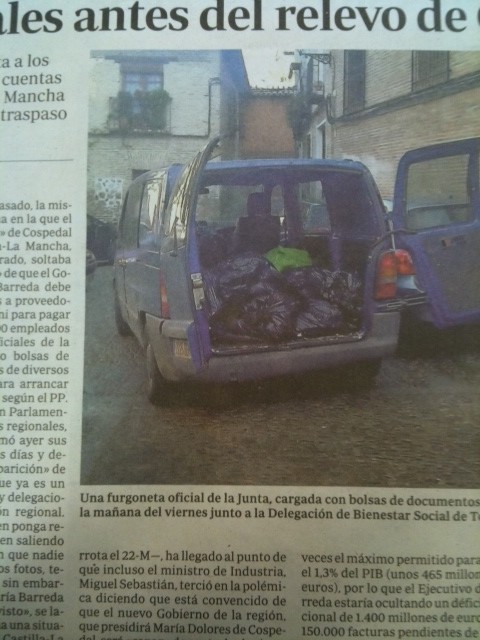 El traspaso de poderes en Castilla-La Mancha tiene visos de ser traumático. A las denuncias del PP, que alertan de una comunidad en "quiebra total" con miles de facturas sin pagar, se han unido también las acusaciones de la destrucción de documentos por parte de la Junta. De hecho, ABC publicaba este domingo las fotos de cómo furgonetas oficiales cargaban bolsas de basura llenas de documentos procedentes de edificios oficiales.