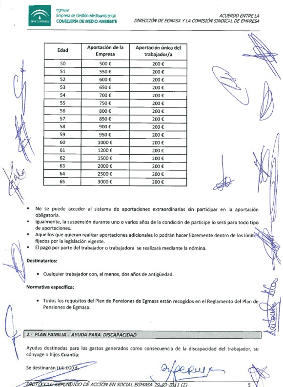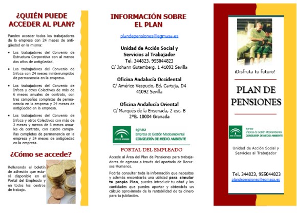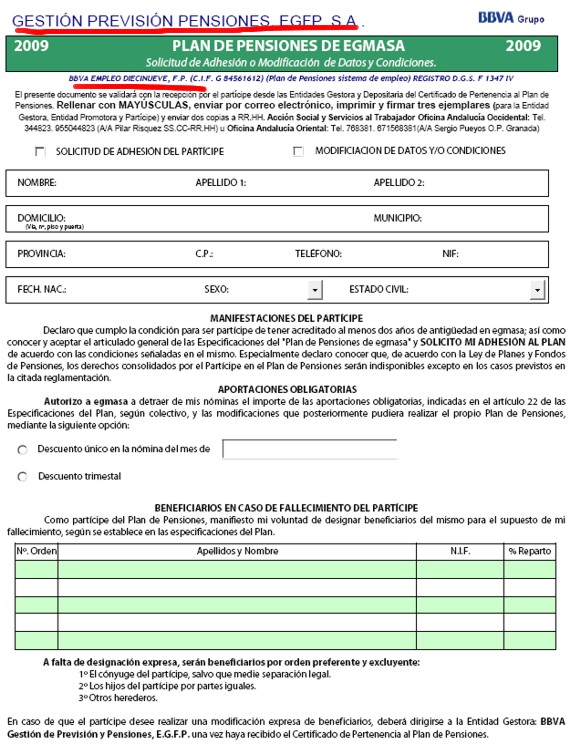 La empresa pública Egmasa enriqueció notablemente el plan de pensiones de la empresa destinado a sus trabajadores con el remanente del fondo de acción social acumulado antes de su reconversión en la nueva Agencia de Medio Ambiente y Agua de la Junta de Andalucía. De hecho, de media, puso 450 euros por trabajador siempre que estos aportaran 200. Pero no informó de que la gestión de ese plan de pensiones iba a ser efectuada por dos empresas en la que participan Comisiones Obreras y UGT. Se trata de Gestión de Previsión y Pensiones Entidad Gestora de Fondos de Pensiones, SA y BBV Empleo 19 Fondo de Pensiones, SA. En ambas, participan estas organizaciones sindicales demostrando hasta qué punto en la reordenación decretada por José Antonio Griñán, conocida como "el decretazo", han sido corresponsables ambos sindicatos. Según el Banco de España, BBV empleo 19 Fondo de Pensiones manejaba ya en 2008 la cantidad de 3,62 millones de euros.