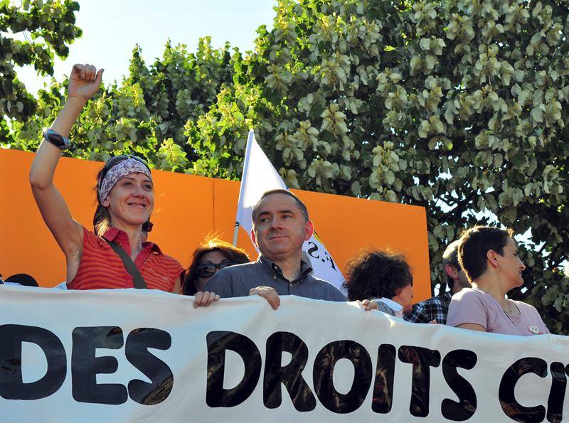 La exdirigente de Batasuna-ETA Aurore Martin, que salió de la clandestinidad a mediados de junio pese a ser objeto de una orden de detención emitida por la Justicia española, reapareció este sábado en una manifestación en Bayona.