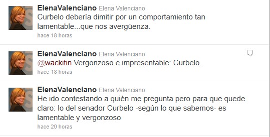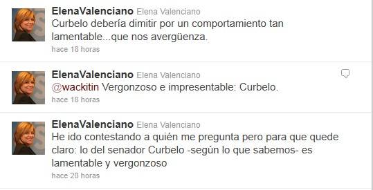 Desde que se conociera el arresto del senador socialista Casimiro Curbelo en Madrid, nadie en el PSOE se había pronunciado sobre ello. Este sábado, a preguntas de los internautas, Elena Valenciano manifestó en Twitter que el senador canario, que también es presidente del cabildo de La Gomera, "debería dimitir por un comportamiento tan lamentable... que nos avergüenza".