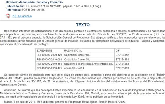 Se dice textualmente en el BOE que "habiéndose intentado las notificaciones a las direcciones postales o electrónicas señaladas a efectos de notificación y no habiéndose podido practicar las mismas, en cumplimiento de lo dispuesto, por el presente anuncio, la Subdirección General de Programas Estratégicos notifica, a los interesados que se relacionan, los actos administrativos firmados por el director general de Industria, que inician el procedimiento de reintegro".
