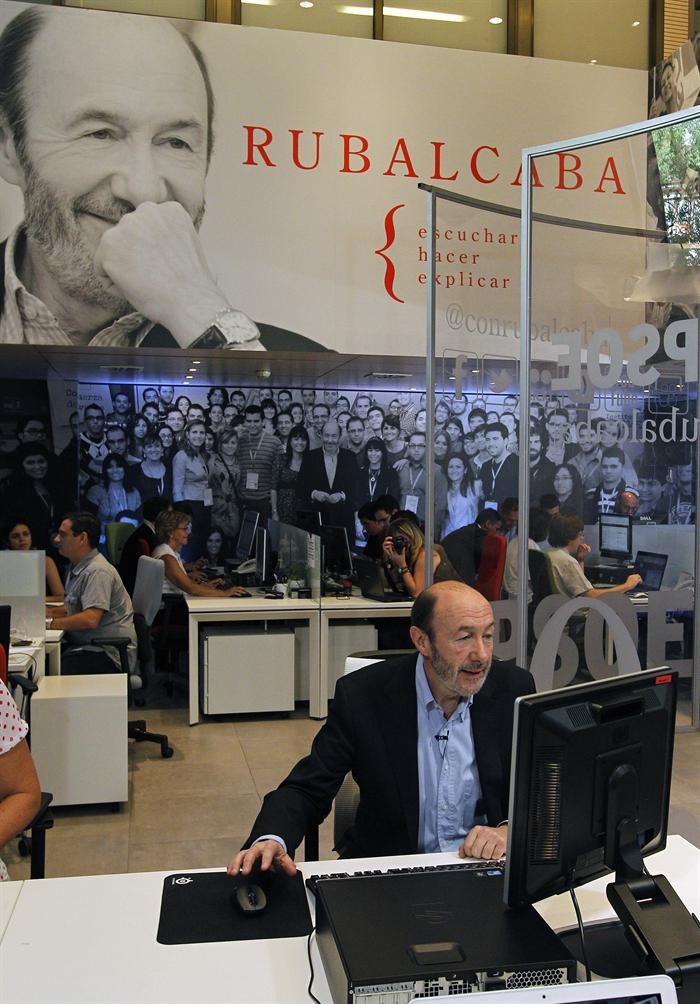 Rubalcaba ha inaugurado un 'espacio 2.0' en la sede del PSOE donde trabajarán unas treinta personas -fruto de una reorganización de departamentos en Ferraz- y ha escrito personalmente sus primeros tuits, al principio y al final de la entrevista, para dejar claro a los internautas su deseo de escuchar y explicarse. Rubalcaba firmará como 'RbCb' los mensajes que escriba él personalmente en la cuenta @conrubalcaba, la que utiliza su equipo electoral.