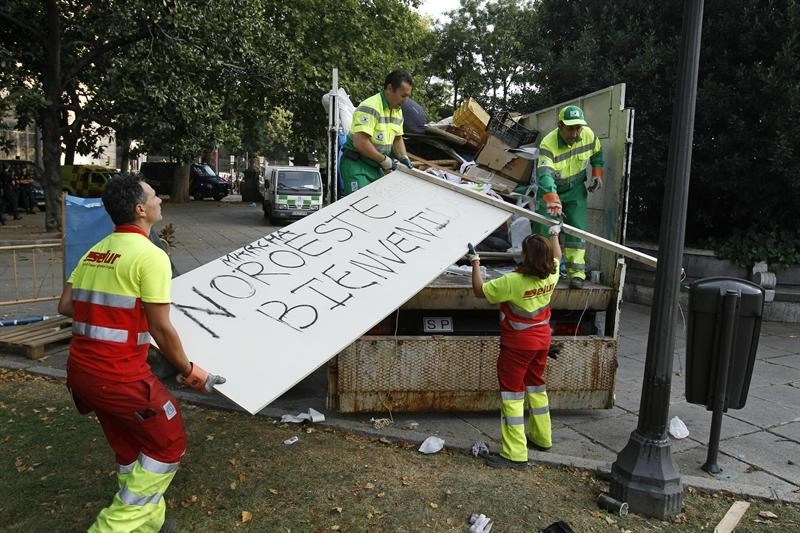 Los empleados del servicio de limpieza urgente del Ayuntamiento (Selur) retiran las últimas tiendas de campaña y cargan en un contenedor de gran tamaño tablones, lonas, sillas y otros elementos que habían quedado tras la acampada.