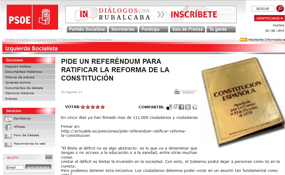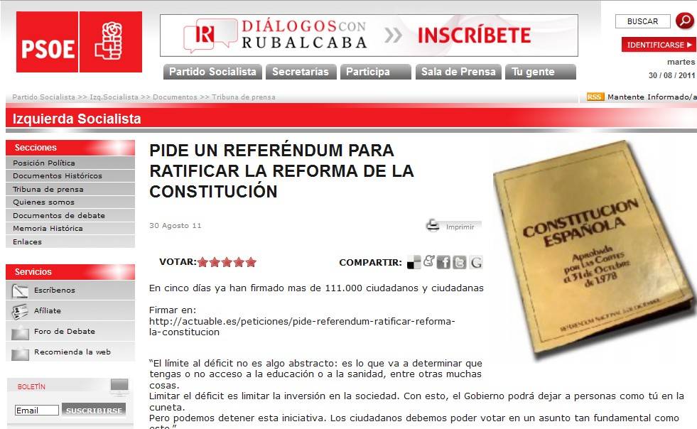 Finalmente, este martes la reforma constitucional pasó su primer trámite parlamentario. Se impuso la disciplina de partido. Sin embargo, hoy, miércoles, por la mañana en la propia página web del PSOE aún se podía leer el documento en el que se pide un referéndum para ratificar la reforma de la Carta Magna.