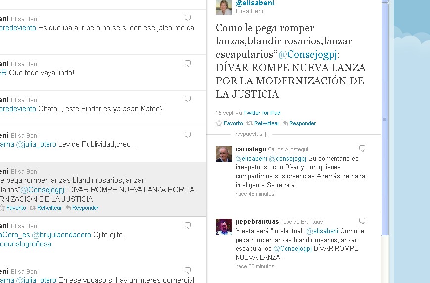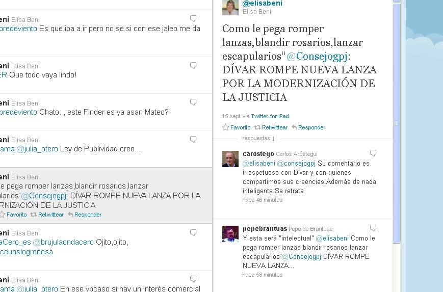 "Como le pega romper lanzas,blandir rosarios,lanzar escapularios"@Consejogpj: Dívar rompe una nueva lana por la modernización de la Justicia", escribió Beni en su cuenta personal, un tweet que todavía sigue colgado.