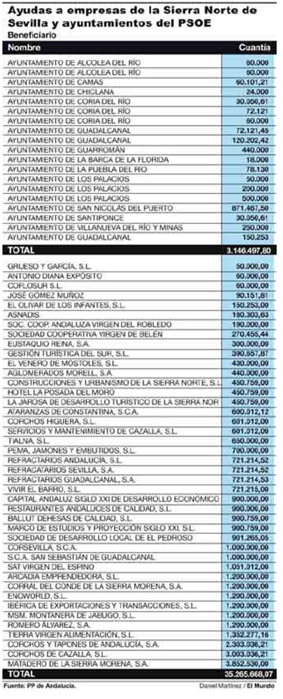 Viera firmó y autorizó 42 ayudas a empresas de la comarca Sierra Norte de Sevilla por un total de 35,2 millones de euros, y a 13 ayuntamientos afines al PSOE por un montante de 3,1 millones, mediante "un procedimiento ilegal y sin control", según el PP, cuando ya existían los informes de la Intervención General de la Junta de Andalucía" que advertían de que el procedimiento era irregular.