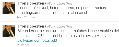 El diputado independentista Alfons López Tena ha escrito en su perfil de Twitter que las palabras de Duran son "homófobas" e "inaceptables" y le lanza un dardo envenenado: "La orientación sexual, homo o hetero, no puede ser tratada psicológicamente, pero la adicción al sexo sí".