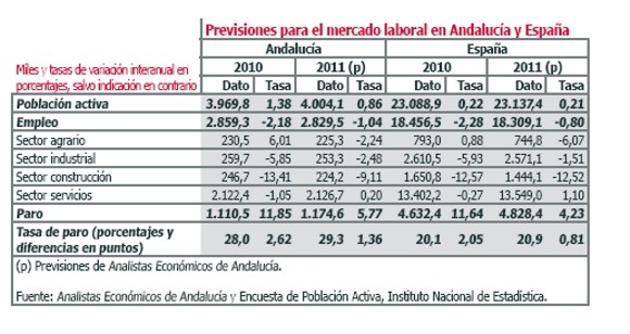 Según el informe, "para el conjunto del año nuestras previsiones señalan que la cifra de ocupados descenderá en este año un 1%, hasta situarse en torno a los 2,83 millones de personas, y únicamente el sector servicios podría registrar un leve avance del empleo, del 0,2 %, con una primera mitad del año bastante más negativa de lo previsto. Por su parte, la cifra de parados podría crecer algo menos de lo estimado anteriormente, en concreto un 5,8 %, a consecuencia del menor ritmo de avance de la población activa, de forma que la tasa de paro se situaría en promedio en el 29,3 %, 1,4 puntos por encima de la media del año 2010 y 8,5 puntos por encima de la tasa prevista para España, aunque en la segunda mitad del año podría frenarse su repunte".