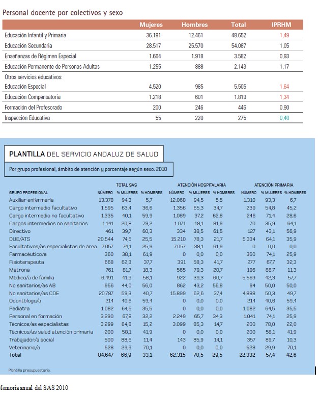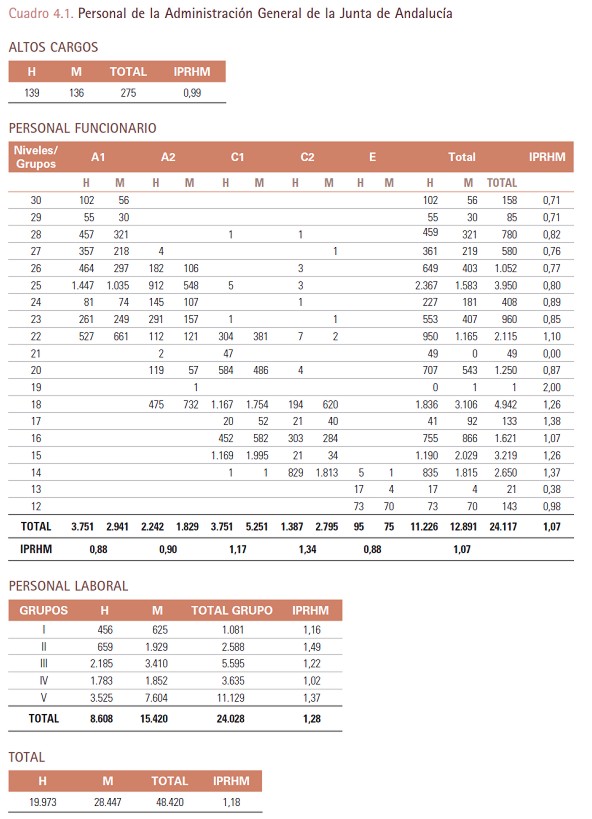 En los Presupuestos para 2012, la Junta de Andalucía incluye un anexo al mismo titulado Informe de evaluación de impacto de género del Presupuesto de la Comunidad Autónoma de Andalucía, donde informa del personal al servicio de la administración general, educación y sanidad, incluyendo a los altos cargos de la misma. Pero el informe oculta el análisis del número y componentes de la llamada administración paralela. Tan sólo se remite a un estudio sobre los directivos de los entes públicos empresariales al que titula Análisis del personal directivo de las agencias públicas empresariales, sociedades mercantiles del sector público y entidades asimiladas.
