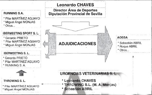Resultaba, además, que las sociedades de los amiguetes de Leo Chaves comenzaron a contratar con la Diputación cuando este fue designado director del área de Deportes. Tampoco parecía casualidad que las mayores adjudicaciones, hasta los 75 millones de pesetas, siempre fueran a parar a empresas vinculadas a Leo Chaves, que era quien hacía un informe previo y preceptivo sobre la concesión y el proyecto de las empresas que se presentaban.