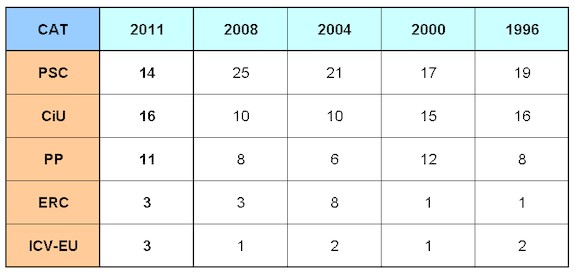 Los otros dos partidos de la región con representación parlamentaria se mueven en direcciones opuestas: ICV-EU pasa de 1 a 3 escaños, en línea con la marea ascendente de IU en toda España. Por su parte, ERC mantiene sus tres representantes, pese a que en estas elecciones se presentaba en una coalición independentista con Catalunya Sí y Reagrupament.
