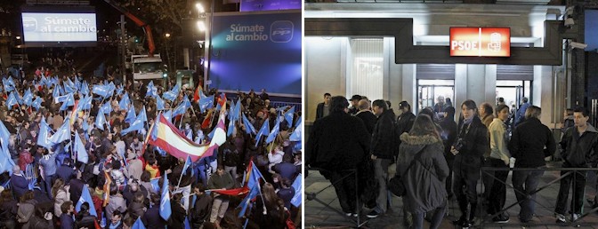 El ambiente, como el día en Madrid, es gris. La calle está tomada por la Policía y los periodistas, pero apenas hay simpatizantes socialistas. Una fotografía que curiosamente se parece bastante a la que pudo hacerse durante la jornada de reflexión en la puerta del Sol con la convocatoria de los llamados indignados.