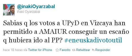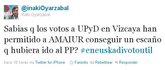 Sabias q los votos a UPyD en Vizcaya han permitido a AMAIUR conseguir un escaño q hubiera ido al PP?, sostuvo en Twitter. En esta provincia, el PP se quedó a diez mil votos de la formación de ETA. Traducido en escaños, Amaiur obtuvo dos y los populares solamente uno. Mientras, UPyD logró casi once mil votos.