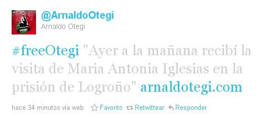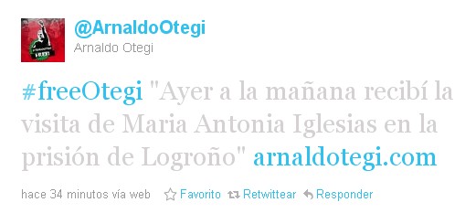 En un escueto mensaje enviado a través de la red social Twitter, donde tiene un perfil que actualizan las personas más cercanas a él, dice: "Ayer a la mañana recibí la visita de María Antonia Iglesias en la prisión de Logroño". El dirigente batasuno se encuentra allí cumpliendo una condena de diez años por pertenencia a organización terrorista en calidad de dirigente.