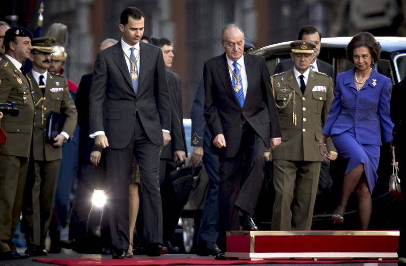 Don Juan Carlos y doña Sofía, acompañados de los príncipes de Asturias, llegaron este mediodía a las proximidades del Palacio de las Cortes, donde fueron recibidos por el presidente del Gobierno, Mariano Rajoy, y por el jefe del Estado Mayor de la Defensa, general del Aire José Julio Rodríguez.