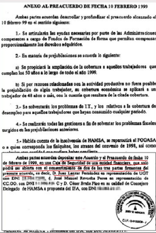 El acuerdo incluía jubilaciones de personal que sólo tenía 48 años de edad. Si alguna puntada le faltaba a este escándalo, ahora se presenta con nocturnidad, alevosía y secretismo de las centrales sindicales UGT, CC.OO y la Junta. El último párrafo del documento, que reproducimos a continuación tomándolo del diario El Mundo, recoge el compromiso de "depositar este acuerdo y el preacuerdo de fecha 10 de febrero de 1999 en una caja de seguridad de una entidad financiera, que sólo podrá ser abierta con el consentimiento de dos de las tres partes firmantes del presente acuerdo".