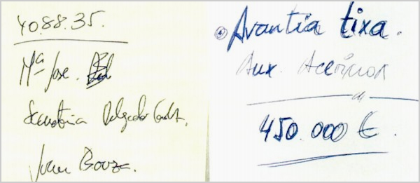 Antonio Sanz también mostró un folio en blanco -postit incorporados- con membrete de la Consejería de Empleo y fechado el 21 de enero de 2010 en el que aparece escrito a mano por parte del viceconsejero de este departamento en esos momentos, Agustín Barberá, "Juan: éste es el tema de Abantia que hemos hablado. El compromiso que Innovación pone son 450.000 euros".