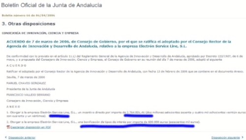 Fue en 2006 cuando la Junta de Andalucía gobernada por Manuel Chaves concedió un incentivo directo de 2.764.821,41 (dos millones setecientos sesenta y cuatro mil ochocientos veintiún euros con cuarenta y un céntimos) a la empresa Electrón Service Line, S.L., y además, le concedió una bonificación de tipos de interés por importe de 600.000 euros (seiscientos mil euros). Fue un acuerdo adoptado por el Consejo Rector de la Agencia de Innovación y Desarrollo de Andalucía, con fecha 13 de febrero de 2006, que se contenía en un documento Anexo y que impulsó el entonces Consejero de Innovación, Francisco Vallejo Serrano. Este es el papelito que lo prueba: