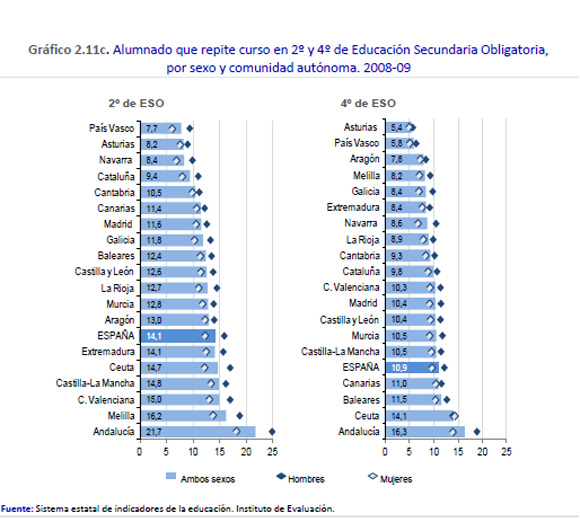 En un estudio realizado por el Ministerio de Educación, Andalucía está a la cola de España en educación secundaria obligatoria(ESO). No sólo tenemos la tasa de repetidores más alta de España, sino que está entre los últimos en comunicación y competencia lingüística, matemáticas, física y sociales.